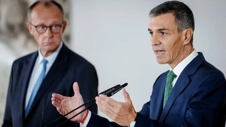 而德国总理默茨坐在一旁一声不吭,更别说帮西班牙说情了。