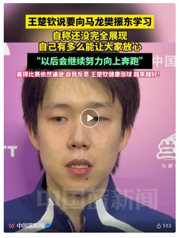 据中国蓝新闻,赛后采访,王楚钦表示希望能够向樊振东、马龙学习,成为像他们那样的人,自己还在努力向上奔跑,王楚钦称:“很荣幸承担责任和压力,自己也在不断的想去进步和努力,希望不断的向龙哥和东哥去学习,希望能成为像他们那样的人,能去真正承担责任和压力。对于自己现在来说,还没有完全向大家展现有多么让大家放心,我还在努力地向上奔跑。”